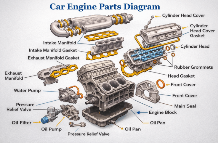 A car engine parts diagram makes everything easier because it shows the engine block, combustion chamber, cylinder head, pistons, crankshaft, camshaft, timing chain, valves, rocker arms, pushrods, lifters, injectors, spark plugs, oil pan, distributor, connecting rods, piston ring, and flywheels in one place. I always tell beginners to study the diagram location of major engine components first, because clear part placement, visual representation, engine structure, mechanical layout, component identification, and overall engine system view improve diagram understanding very quickly.